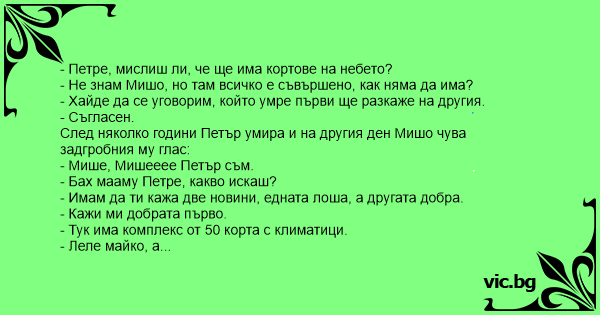 - Хайде да се уговорим, който умре първи ще разкаже на другия.