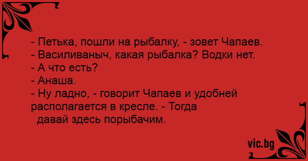 - Петька, пошли на рыбалку, - зовет Чапаев.