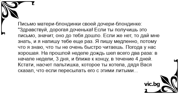 "Здравствуй, дорогая доченька! Если ты получишь это письмо, значит, оно до тебя дошло. Если же нет, то дай мне знать, и я напишу тебе ещe раз. Я пишу медленно, потому что я знаю, что ты не очень быстро читаешь. Погода у нас хорошая. На прошлой неделе дождь шел всего два раза: в начале недели, 3 дня, и ближе к концу, в течение 4 дней. Кстати, насчет пальтишка, которое ты хотела, дядя Вася сказал, что если пересылать его с этими литыми пуговицами, то это выйдет слишком дорого по весу, поэтому я их отрезала. Пришей их обратно, я положила их в правый кармашек. Твой папа нашeл новую работу. Под ним 500 человек! Он косит траву на кладбище. Твоя сестра Настя недавно вышла замуж, и ждет малыша. Мы не знаем, какого он пола, поэтому пока что не могу тебе сказать, будешь ли ты дядей или тeтей. Если это девочка, то она хочет еe назвать, как меня. Немного странное решение, назвать свою дочку Мама. С твоим братом Толей недавно случился казус: он закрыл свою машину, а ключи оставил внутри. Ему пришлось вернуться домой пешком ( 10 километров!), чтобы взять второй комплект ключей, и выпустить нас из машины. Если ты вдруг встретишь свою кузину Лилю, то передай ей от меня привет. Eсли ты еe не встретишь, то ничего ей не говори. Твоя мама.
