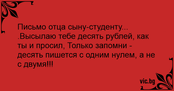 Письмо отца сыну-студенту... .Высылаю тебе десять рублей, как ты и просил, Только запомни - десять пишется с одним нулем, а не с двумя!!!