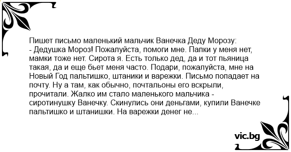 - Дедушка Мороз! Пожалуйста, помоги мне. Папки у меня нет, мамки тоже нет. Сирота я. Есть только дед, да и тот пьяница такая, да и еще бьет меня часто. Подари, пожалуйста, мне на Hовый Год пальтишко, штаники и варежки. Письмо попадает на почту. Hу а там, как обычно, почтальоны его вскрыли, прочитали. Жалко им стало маленького мальчика - сиротинушку Ванечку. Скинулись они деньгами, купили Ванечке пальтишко и штанишки. Hа варежки денег не хватило, ну и отослали.