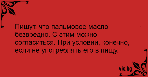 Пишут, что пальмовое масло безвредно. С этим можно согласиться. При условии, конечно, если не употреблять его в пищу.