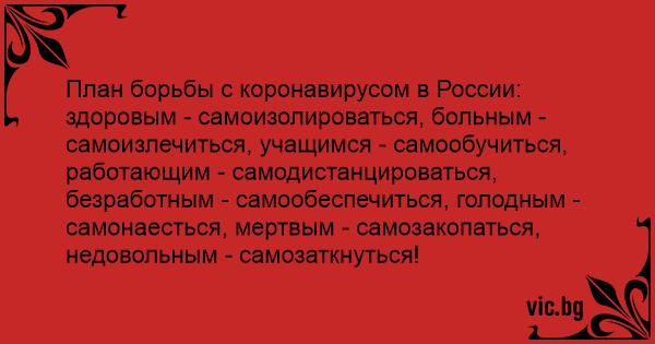 План борьбы с коронавирусом в России: здоровым - самоизолироваться, больным - самоизлечиться, учащимся - самообучиться, работающим - самодистанцироваться, безработным - самообеспечиться, голодным - самонаесться, мертвым - самозакопаться, недовольным - самозаткнуться!