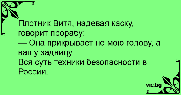Плотник Витя, надевая каску, говорит прорабу: