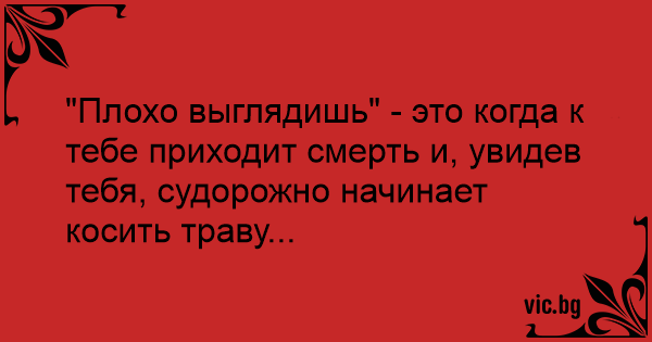 "Плохо выглядишь" - это когда к тебе приходит смерть и, увидев тебя, судорожно начинает косить траву...