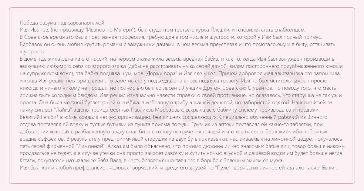 Победа разума над сарсапариллой Изя Иванов, (по прозвищу "Иванов по Матери"), был студентом третьего курса Плешки, и готовился стать снабженцем. В Советское время это была престижная профессия, требующая в том числе и шустрости, которой у Изи был полный примус. Вдобавок он очень любил крутить романы с замужними дамами, в чем весьма преуспевал и что помогало ему и в быту, оттачивать шустрость. В доме, где жила одна из его пассий, на первом этаже жила весьма вредная бабка, и как-то, когда Изя был вынужден производить эвакуацию любимого себя со второго этажа (дабы не расстраивать мужа своей дамой, видом постороннего полуобнаженного юноши на супружеском ложе), эта бабка подняла шум, мол "Держи вора" и Изя еле ушел. Причем добровольная альгвазилка его запомнила, и когда Изя решил повторить визит, то заметив его у подъезда, она вновь подняла тревогу. Изя не был мстительным, он просто никогда и ничего никому не прощал, но полностью был согласен с Лучшим Другом Советских Студентов, по поводу того, что месть должна быть холодным блюдом. Изя решил изначально навести справки о своей противнице, но оказалось, что старушка не так уж и проста. Она была местной бутлегершой и снабжала избранную трибу алкашей дешёвой, но забористой водкой. Нанятые Изей за пачку сигарет "Лайка" в день, троица местных Павликов Морозовых, вскрыла всю бабкину систему производства и продажи. Великий Гэтсби* в юбке, создала четкую организацию, без лишних составляющих. Специально обученный рабочий из Винного отдела поставлял ей водку и пустые бутылки из пункта приема посуды. Грузчик из аптеки поставлял ей какие-то таблетки, при добавлении которых в разбавленную водку оная била в голову покруче настоящей и что характерно, без каких-либо побочных вредных эффектов. В результате у предприимчивой старушки из двух бутылок казенки, настаиваемых на лимонной цедре, получалось пять своей фирменной "Лимонной". Алкашам было объяснено, что помимо дюжины лично знакомых бабке лиц, товар больше никому продаваться не будет, а в случае утечки она просто закроет лавочку и купить ночью вкусной и дешёвой водки им будет больше негде. Кстати, покупатели называли ее Баба Вася, в честь безвременно павшего в борьбе с Зеленым змием ее мужа. Изя был, как и любой преферансист, человек творческий, и среди его друзей по "Пуле" творческих личностей хватало также. Были мобилизованы следующие силы: 1.Трое ранее завербованных Павликов Морозовых, для отслеживания маршрута бабки и докладов по команде. 2.Друг-преферансист из Щуки, в гриме и костюме Деда Щукаря. 3.Приятели друга-преферансиста, с актерского факультета, для массовки. Итак, мизансцена такая... Баба Вася мирно пошла в Аптеку за хитрыми таблетками и возле Аптеки ее перехватил деревенский дедок, попросив купить ему на десять рублей аспирину, а то жадная аптекарша, больше не хочет продавать, а он рублевку за услугу накинет. После пятиминутного торга сошлись на рубле пятидесяти. Дед получил свой аспирин и радостно куда-то ушкандыбал, причем на вопросы, а зачем ему столько аспирина, косноязычно оправдывался и судя по всему все время врал. Бутлегерша задумалась и так же задумчиво, медленно прошла мимо группы молодых людей, которые весело что-то обсуждали и среди непонятных терминов, типа плантация и сарсапарилла, она вдруг услышала знакомые слова аспирин и цена.