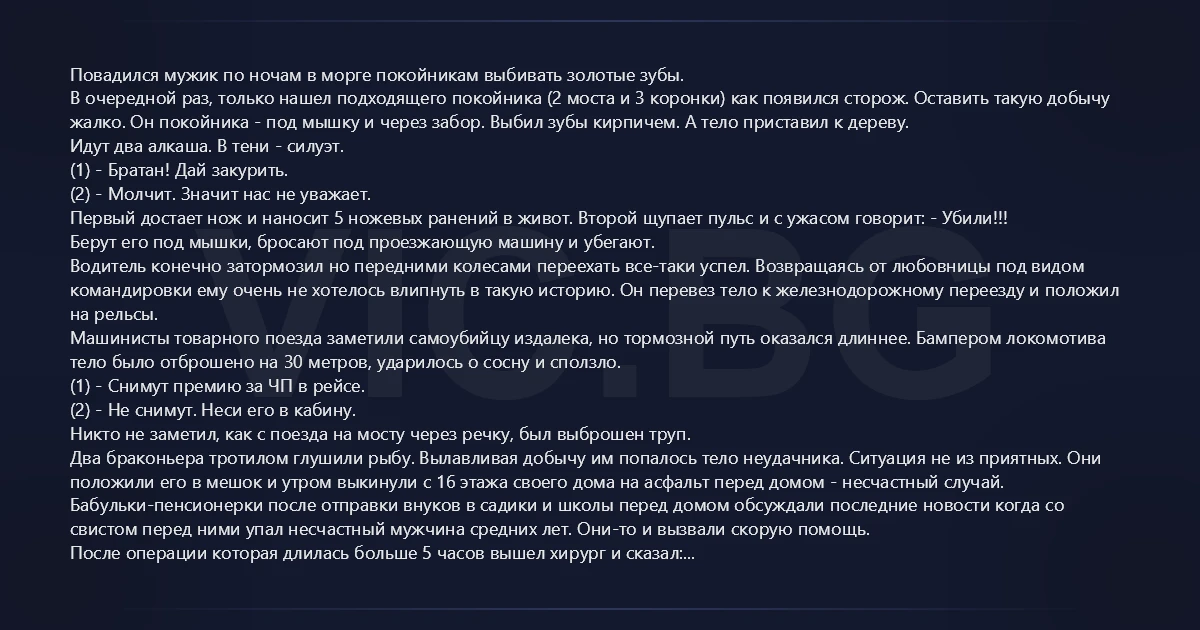 Повадился мужик по ночам в морге покойникам выбивать золотые зубы. В очередной раз, только нашел подходящего покойника (2 моста и 3 коронки) как появился сторож. Оставить такую добычу жалко. Он покойника - под мышку и через забор. Выбил зубы кирпичем. А тело приставил к дереву. Идут два алкаша. В тени - силуэт. (1) - Братан! Дай закурить. (2) - Молчит. Значит нас не уважает. Первый достает нож и наносит 5 ножевых ранений в живот. Второй щупает пульс и с ужасом говорит: - Убили!!! Берут его под мышки, бросают под проезжающую машину и убегают. Водитель конечно затормозил но передними колесами переехать все-таки успел. Возвращаясь от любовницы под видом командировки ему очень не хотелось влипнуть в такую историю. Он перевез тело к железнодорожному переезду и положил на рельсы. Машинисты товарного поезда заметили самоубийцу издалека, но тормозной путь оказался длиннее. Бампером локомотива тело было отброшено на 30 метров, ударилось о сосну и сползло. (1) - Снимут премию за ЧП в рейсе. (2) - Не снимут. Неси его в кабину. Никто не заметил, как с поезда на мосту через речку, был выброшен труп. Два браконьера тротилом глушили рыбу. Вылавливая добычу им попалось тело неудачника. Ситуация не из приятных. Они положили его в мешок и утром выкинули с 16 этажа своего дома на асфальт перед домом - несчастный случай. Бабульки-пенсионерки после отправки внуков в садики и школы перед домом обсуждали последние новости когда со свистом перед ними упал несчастный мужчина средних лет. Они-то и вызвали скорую помощь. После операции которая длилась больше 5 часов вышел хирург и сказал: - Случай очень тяжелый, но жить будет.