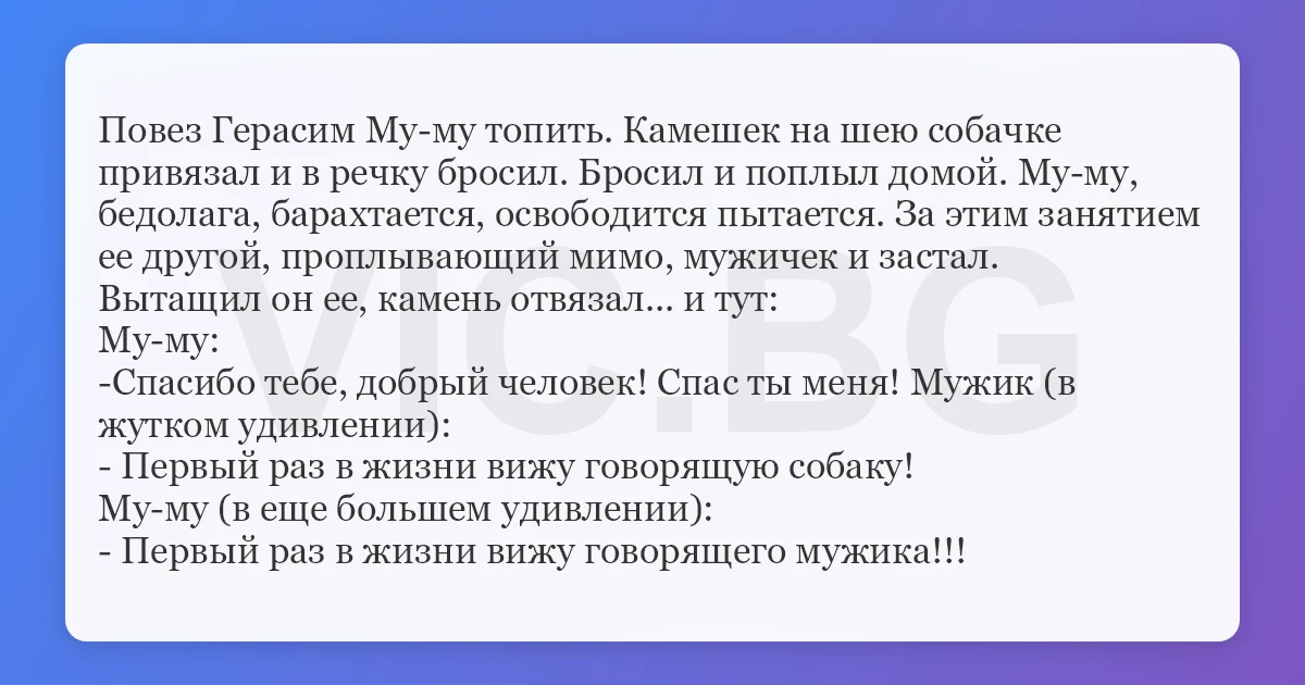 Повез Герасим Му-му топить. Камешек на шею собачке привязал и в речку бросил. Бросил и поплыл домой. Му-му, бедолага, барахтается, освободится пытается. За этим занятием ее другой, проплывающий мимо, мужичек и застал.