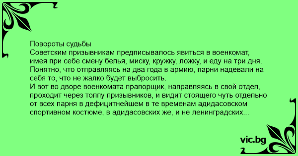 Советским призывникам предписывалось явиться в военкомат, имея при себе смену белья, миску, кружку, ложку, и еду на три дня. Понятно, что отправляясь на два года в армию, парни надевали на себя то, что не жалко будет выбросить. И вот во дворе военкомата прапорщик, направляясь в свой отдел, проходит через толпу призывников, и видит стоящего чуть отдельно от всех парня в дефицитнейшем в те временам адидасовском спортивном костюме, в адидасовских же, и не ленинградских лицензионных а в настоящих германских адидасовских кроссовках. Завершающим штрихом этого оксюморона была завернутая в газетку палка сырокопченой колбасы, которую спортсмен держал в руке. Прапорщик осведомился у парня – и почему он здесь именно в такой экипировке. Парень охотно пояснил, что насчёт него «всё договорено», направят его сейчас в Москву в спорт-роту, а ночевать он уже сегодня будет дома. Прапорщик спросил у него фамилию, зашел в отдел призыва, и переложил одну папку в другую стопку. Это было утром. А обедал спортсмен в тот день уже на борту самолёта летящего в Комсомольск-на-Амуре, в составе команды призывников распределённых на Краснознамённый Тихоокеанский флот.