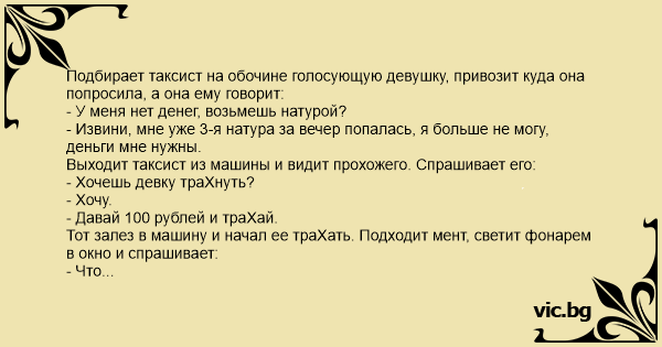 Подбирает таксист на обочине голосующую девушку, привозит куда она попросила, а она ему говорит: