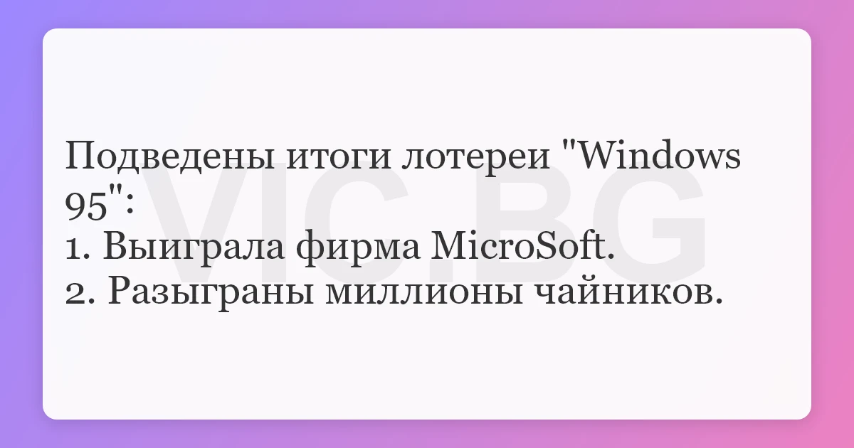 Подведены итоги лотереи "Windows 95":1. Выиграла фирма MicroSoft.2. Разыграны миллионы чайников. 15 0 0 Анекдоты