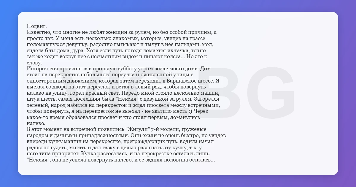 Подвиг. Известно, что многие не любят женщин за рулем, но без особой причины, а просто так. У меня есть несколько знакомых, которые, увидев на трассе поломавшуюся девушку, радостно гыгыкают и тычут в нее пальцами, мол, сидела б ты дома, дура. Хотя если чуть погодя ломается их тачка, точно так же ходят вокруг нее с несчастным видом и пинают колеса... Но это к слову. История сия произошла в прошлую субботу утром возле моего дома. Дом стоит на перекрестке небольшого переулка и оживленной улицы с односторонним движением, которая затем переходит в Варшавское шоссе. Я выехал со двора на этот переулок и встал в левый ряд, чтобы повернуть налево на улицу, горел красный свет. Передо мной стояло несколько машин, штук шесть, самая последняя была "Нексия" с девушкой за рулем. Загорелся зеленый, народ набился на перекресток и ждал просвета между встречными, чтобы повернуть, я на перекресток не выехал - не хватило места :) Через какое-то время образовался просвет и кто стоял первым, ломанулись налево. В этот момент на встречной появились "Жигули" 7-й модели, груженые народом и дачными принадлежностями. Они ехали не очень быстро, но увидев впереди кучку машин на перекрестке, преграждающих путь, водила начал радостно гудеть, мигать и дал газку с целью разогнать эту кучку, т.к. у него типа приоритет. Kучka рассосалась, и на перекрестке осталась лишь "Нексия", она не успела повернуть налево, и ее задняя половина осталась на своей полосе, а морда - на вражеской. Увидев такой непорядок, "семерка" сунула еще газку и врубила клаксон на всю катушку. Девушка в "Нексии" закрыла лицо руками и взвизгнула. Через долю секунды "жигуль" снес "Нексии" половину морды, ободрал об нее себе весь левый бок и, под конец, уебался в какой-то строительный знак, стоявший возле тротуара чуть дальше. Это ж хуйня: расхерачить две машины, подвергнуть опасности как минимум здоровье, а то и жизни нескольких человек, из которых трое - члены твоей семьи, убить к чертовой матери выходные, а потом еще несколько недель ходить в ГАИ, к экспертам, в страховые компании, ездить по автосервисам... Зато воспользоваться своим приоритетом - как же ж так: ЕМУ преградила путь БАБА, на НОВЕНЬКОЙ ИНОМАРКЕ, в то время как честные люди могут себе позволить лишь "жигуль", и всем известно, что баба может заработать на машину лишь одним способом, и уже поэтому любое лицо женского пола лет 20-30 за рулем является блядью... Вот такой, блин, народный мститель, летчик Гастеллло, понимашь... Саша