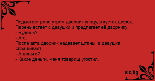 Подметает рано утром дворник улицу, в кустах шорох. Парень встаёт с девушки и предлагает её дворнику: