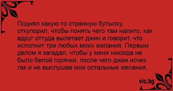 Поднял какую-то странную бутылку, откупорил, чтобы понять чего там налито, как вдруг оттуда вылетает джин и говорит, что исполнит три любых моих желания. Первым делом я загадал, чтобы у меня никогда не было белой горячки, после чего джин исчез так и не выслушав мои остальные желания.