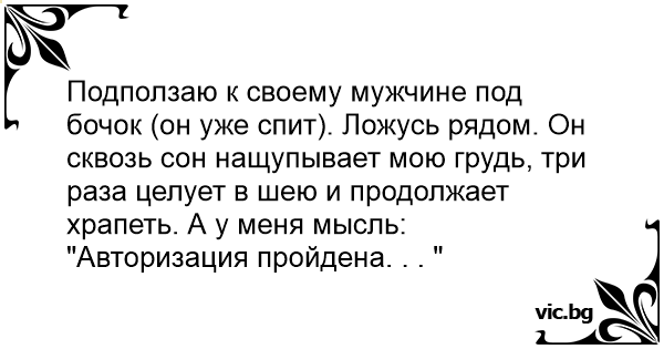 Подползаю к своему мужчине под бочок (он уже спит). Ложусь рядом. Он сквозь сон нащупывает мою грудь, три раза целует в шею и продолжает храпеть. А у меня мысль: