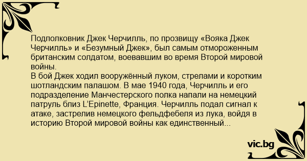 Подполковник Джек Черчилль, по прозвищу «Вояка Джек Черчилль» и «Безумный Джек», был самым отмороженным британским солдатом, воевавшим во время Второй мировой войны.