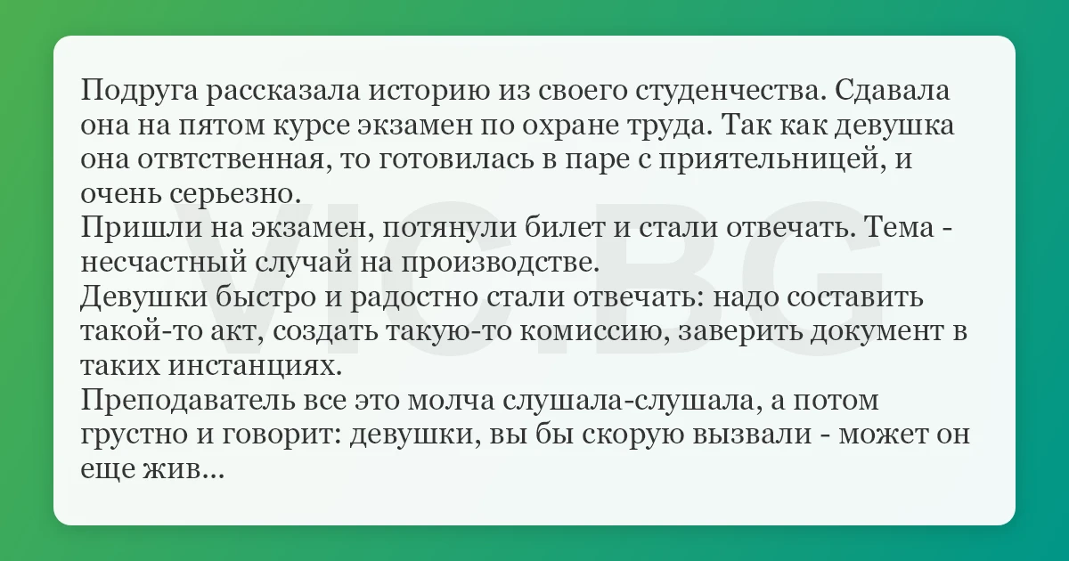Подруга рассказала историю из своего студенчества. Сдавала она на пятом курсе экзамен по охране труда. Так как девушка она отвтственная, то готовилась в паре с приятельницей, и очень серьезно. Пришли на экзамен, потянули билет и стали отвечать. Тема - несчастный случай на производстве. Девушки быстро и радостно стали отвечать: надо составить такой-то акт, создать такую-то комиссию, заверить документ в таких инстанциях. Преподаватель все это молча слушала-слушала, а потом грустно и говорит: девушки, вы бы скорую вызвали - может он еще жив...