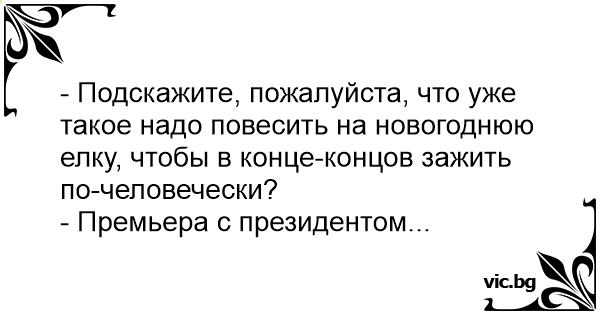 - Някои има ли идея, какво трябва да окача на новогодишната елха, така че следващата година да ми е по успешна? - Аз знам, примиера и президента