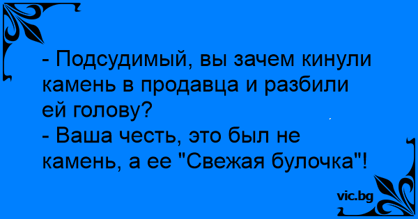 - Подсудимый, вы зачем кинули камень в продавца и разбили ей голову?