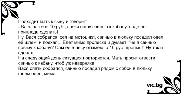 Ну, Вася собрался, сел на мотоцикл, свинью в люльку посадил одел ей шлем, и поехал... Едет мимо пролеска и думает: "че я свинью повезу к кабану? Сам ее в лесу отымею, а 10 руб. пропью!" Ну так и сделал.