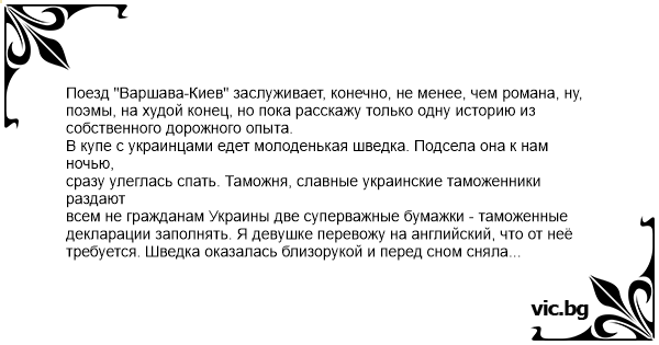 Поезд "Варшава-Киев" заслуживает, конечно, не менее, чем романа, ну, поэмы, на худой конец, но пока расскажу только одну историю из собственного дорожного опыта.