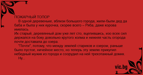 ПОЖАРНЫЙ ТОПОР В одной деревеньке, вблизи большого города, жили-были дед да баба и была у них курочка, скорее всего – Ряба, даже корова имелась.