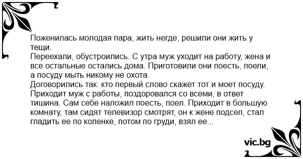 Договорились так: кто первый слово скажет тот и моет посуду. Приходит муж с работы, поздоровался со всеми, в ответ тишина. Сам себе наложил поесть, поел. Приходит в большую комнату, там сидят телевизор смотрят, он к жене подсел, стал гладить ее по коленке, потом по груди, взял ее тут же и тр@хнул, в ответ тишина. Тоже самое проделал с тещей, в ответ опять тишина. Пошел на балкон покурить, там сигаретой губу обжег. Возвращается в комнату и спрашивает: