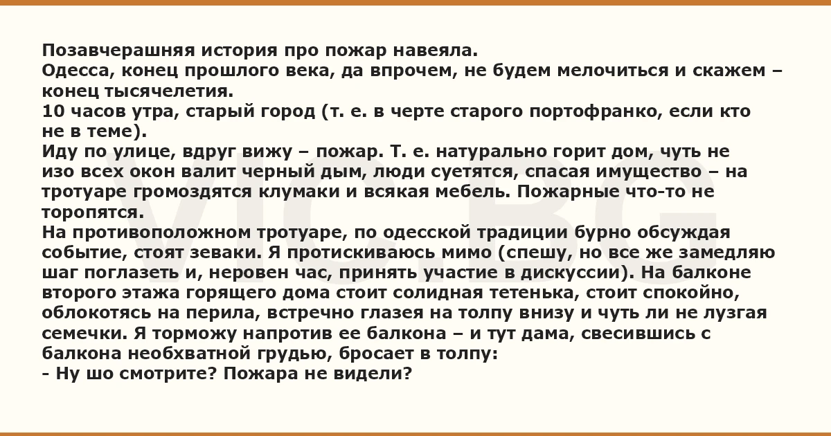 Позавчерашняя история про пожар навеяла. Одесса, конец прошлого века, да впрочем, не будем мелочиться и скажем – конец тысячелетия. 10 часов утра, старый город (т. е. в черте старого портофранко, если кто не в теме). Иду по улице, вдруг вижу – пожар. Т. е. натурально горит дом, чуть не изо всех окон валит черный дым, люди суетятся, спасая имущество – на тротуаре громоздятся клумаки и всякая мебель. Пожарные что-то не торопятся. На противоположном тротуаре, по одесской традиции бурно обсуждая событие, стоят зеваки. Я протискиваюсь мимо (спешу, но все же замедляю шаг поглазеть и, неровен час, принять участие в дискуссии). На балконе второго этажа горящего дома стоит солидная тетенька, стоит спокойно, облокотясь на перила, встречно глазея на толпу внизу и чуть ли не лузгая семечки. Я торможу напротив ее балкона – и тут дама, свесившись с балкона необхватной грудью, бросает в толпу: - Ну шо смотрите? Пожара не видели?