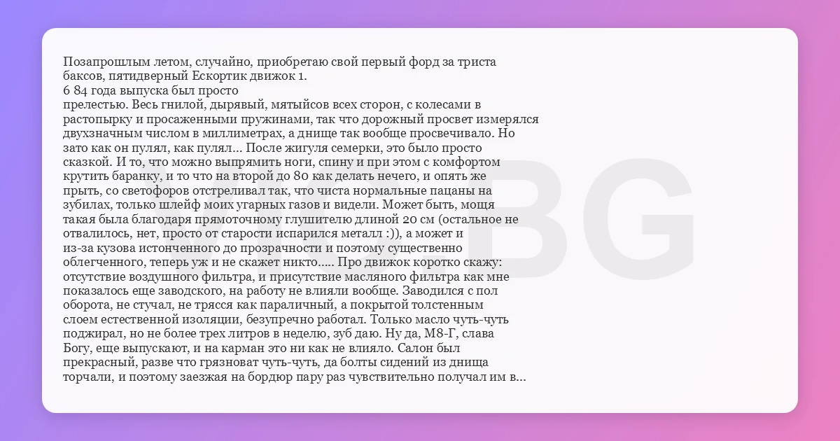 Позапрошлым летом, случайно, приобретаю свой первый форд за триста баксов, пятидверный Ескортик движок 1. 6 84 года выпуска был просто прелестью. Весь гнилой, дырявый, мятыйсов всех сторон, с колесами в растопырку и просаженными пружинами, так что дорожный просвет измерялся двухзначным числом в миллиметрах, а днище так вообще просвечивало. Но зато как он пулял, как пулял… После жигуля семерки, это было просто сказкой. И то, что можно выпрямить ноги, спину и при этом с комфортом крутить баранку, и то что на второй до 80 как делать нечего, и опять же прыть, со светофоров отстреливал так, что чиста нормальные пацаны на зубилах, только шлейф моих угарных газов и видели. Может быть, мощя такая была благодаря прямоточному глушителю длиной 20 см (остальное не отвалилось, нет, просто от старости испарился металл :)), а может и из-за кузова истонченного до прозрачности и поэтому существенно облегченного, теперь уж и не скажет никто….. Про движок коротко скажу: отсутствие воздушного фильтра, и присутствие масляного фильтра как мне показалось еще заводского, на работу не влияли вообще. Заводился с пол оборота, не стучал, не трясся как параличный, а покрытой толстенным слоем естественной изоляции, безупречно работал. Только масло чуть-чуть поджирал, но не более трех литров в неделю, зуб даю. Ну да, М8-Г, слава Богу, еще выпускают, и на карман это ни как не влияло. Салон был прекрасный, разве что грязноват чуть-чуть, да болты сидений из днища торчали, и поэтому заезжая на бордюр пару раз чувствительно получал им в мягкую точку, но, черт побери, передние стеклышки были на кнопочках, что все компенсировало. И вот, после двух недельного испытания на московских ухабах и ямах решили опробовать коня в чистом поле. Рванули мы на нем с другом в Сочи. Идея, естественно, пришла спонтанно, за бутылками накануне вечером. С машиной решили так, если где в дороге она аннигилирует, доберемся до пункта назначения поездом, даже для более чем вероятных поминок все захватили :). И вот мы в пути. Наши приключения начались далеко не сразу, а где-то уже в километрах 30 :))) от МКАДа, когда я после заправки горючки и масла не захлопнул как следует капот, на радостях позабыв, что имеется некая его деформация, требующая несколько больших усилий для плотного его закрытия. Капот моего отличного Фордика не вырвало на скорости 120, он всего лишь плотно прижался к лобовухе, а щелочки на нем, для забора воздуха, предоставляют вполне нормальный обзор. Так, что с комфортом, напевая песенку танкистов и под аккомпанемент дудок больших фур, коих мы еще несколько обогнали, припарковались к обочине. Капот особо не сломался, так немножко сложился пополам и операция открыть-закрыть превратилась в отколотить-заколотить подручным тяжелым средством. Ну не буду рассказывать о куче подобных происшествий, а сразу перейду к главному приключению… Значит позади уже 1000 км, подъезжаем к Ростову-на-Дону, трасса отличная, по две полосы в каждую сторону, а местами так даже по три. Весь запыленный товарищ спал (откуда пыль просачивалась - загадка всех времен и народов :)). Да и мне уже особо радостно не было, однообразный пейзаж наскучил, и закатное солнце хоть было и справа, но здорово слепило. И вдруг Чудо. Чудо! Чудо!!! Я не верю своим глазам, на дороге копия нашего форда. Просто один в один, и цветом и состоянием и всем-всем-всем, 