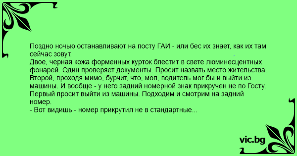 Поздно ночью останавливают на посту ГАИ - или бес их знает, как их там сейчас зовут.