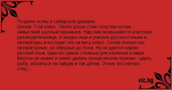 Школа. 7-ой класс. Около доски стоит опустив голову невысокий щуплый парнишка. Над ним возвышается классная руководительница, а заодно еще и учитель русского языка и литературы и костерит его на весь класс. Слова полностью литературные, но обидные до боли. Ну не дается парню русский язык, один из самых сложных для изучения в мире. Многое он может и умеет делать лучше многих мужчин - удить рыбу, охотиться на зайцев и так далее. Этому его научил отец, погибший в прошлом году в автокатастрофе. После этого парень практически перестал учиться, но после разговора с матерью все же продолжил посещать школу на автомате. Цели в жизни стали размытыми и далекими.