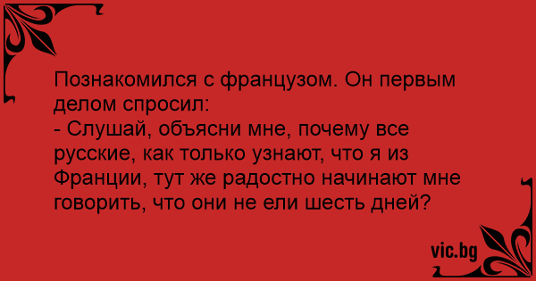 Познакомился с французом. Он первым делом спросил:<br />- Слушай, объясни мне, почему все русские, как только узнают, что я из Франции, тут же радостно начинают мне говорить, что они не ели шесть дней?