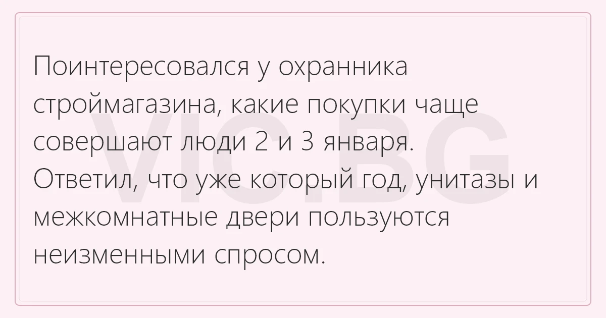 Поинтересовался у охранника строймагазина, какие покупки чаще совершают люди 2 и 3 января. Ответил, что уже который год, унитазы и межкомнатные двери пользуются неизменными спросом.