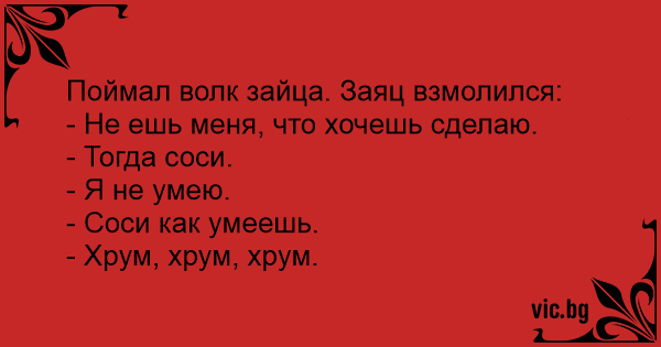 Złapał wilk zająca. - Proszę wilku, nie zabijaj mnie. Zrobię, co zechcesz. - To zrób mi loda. - Nie umiem... - Rób loda. - Kiedy nie umiem... - To rób tak jak umiesz. - Chrup, chrup, chrup...