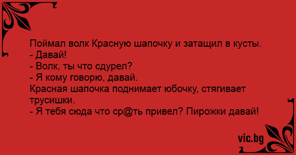 Тоалетна хартија Върви си Червената Шапчица из гората. Изведнъж от храстите се показва главата на Кумчо Вълчо: Scufita Rosie leagana cosuletul in manuta Mergind vioaie si vesela spre bunicuta. La un moment dat o voce groasa si cam infundata Din tufis: - Stai pe loc, sunt lupul fioros, ce-ai in Cosulet ? -... Йде Червона Шапочка лісом. Раптом чує грізний голос вовка з кущів: — Стій, хто йде? - Це я, Червона Шапочка... - Куди йдеш? - До бабусі. - Що несеш? - Пиріжки в папірець загорнуті... - Папірець...