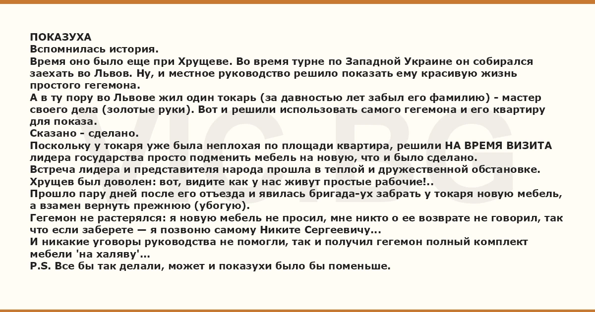 ПОКАЗУХА Вспомнилась история. Время оно было еще при Хрущеве. Во время турне по Западной Украине он собирался заехать во Львов. Ну, и местное руководство решило показать ему красивую жизнь простого гегемона. А в ту пору во Львове жил один токарь (за давностью лет забыл его фамилию) - мастер своего дела (золотые руки). Вот и решили использовать самого гегемона и его квартиру для показа. Сказано - сделано. Поскольку у токаря уже была неплохая по площади квартира, решили НА ВРЕМЯ ВИЗИТА лидера государства просто подменить мебель на новую, что и было сделано. Встреча лидера и представителя народа прошла в теплой и дружественной обстановке. Хрущев был доволен: вот, видите как у нас живут простые рабочие!.. Прошло пару дней после его отъезда и явилась бригада-ух забрать у токаря новую мебель, а взамен вернуть прежнюю (убогую). Гегемон не растерялся: я новую мебель не просил, мне никто о ее возврате не говорил, так что если заберете — я позвоню самому Никите Сергеевичу... И никакие уговоры руководства не помогли, так и получил гегемон полный комплект мебели 'на халяву'... P.S. Все бы так делали, может и показухи было бы поменьше.