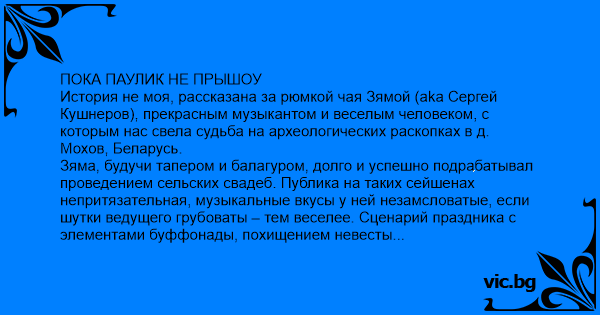 ПОКА ПАУЛИК НЕ ПРЫШОУ История не моя, рассказана за рюмкой чая Зямой (aka Сергей Кушнеров), прекрасным музыкантом и веселым человеком, с которым нас свела судьба на археологических раскопках в д.