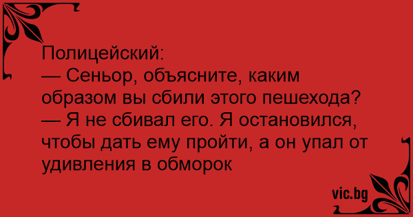 Полицейский:<br />— Сеньор, объясните, каким образом вы сбили этого пешехода?<br />— Я не сбивал его. Я остановился, чтобы дать ему пройти, а он упал от удивления в обморок