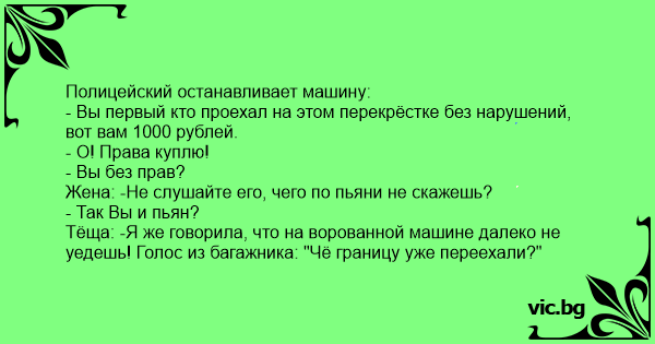 Тёща: -Я же говорила, что на ворованной машине далеко не уедешь! Голос из багажника: "Чё границу уже переехали?"