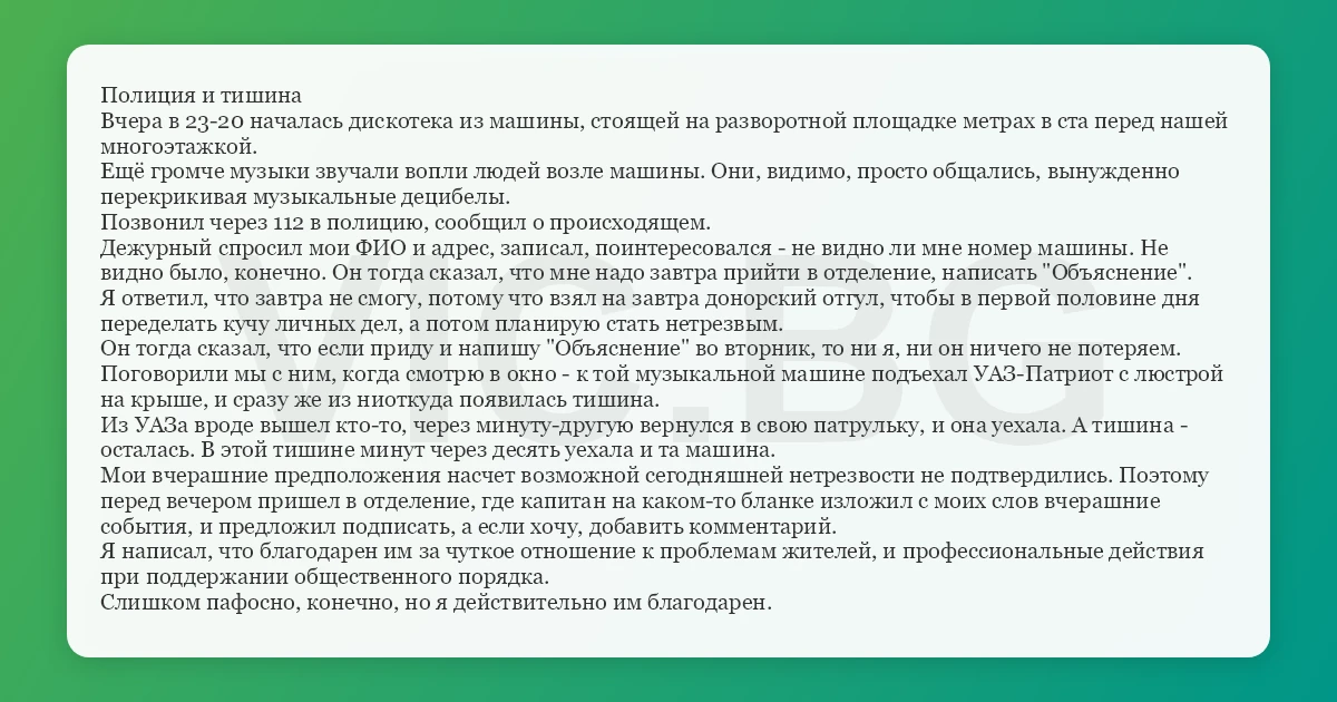 Поговорили мы с ним, когда смотрю в окно - к той музыкальной машине подъехал УАЗ-Патриот с люстрой на крыше, и сразу же из ниоткуда появилась тишина.