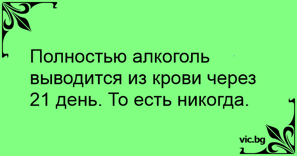 Полностью алкоголь выводится из крови через 21 день. То есть никогда.