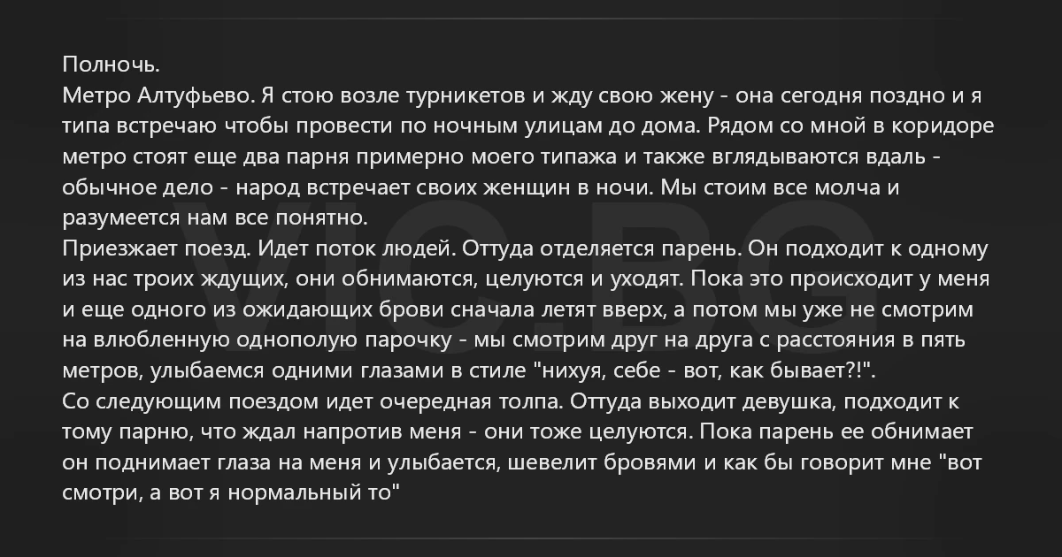 Полночь. Метро Алтуфьево. Я стою возле турникетов и жду свою жену - она сегодня поздно и я типа встречаю чтобы провести по ночным улицам до дома. Рядом со мной в коридоре метро стоят еще два парня примерно моего типажа и также вглядываются вдаль - обычное дело - народ встречает своих женщин в ночи. Мы стоим все молча и разумеется нам все понятно. Приезжает поезд. Идет поток людей. Оттуда отделяется парень. Он подходит к одному из нас троих ждущих, они обнимаются, целуются и уходят. Пока это происходит у меня и еще одного из ожидающих брови сначала летят вверх, а потом мы уже не смотрим на влюбленную однополую парочку - мы смотрим друг на друга с расстояния в пять метров, улыбаемся одними глазами в стиле "нихуя, себе - вот, как бывает?!". Со следующим поездом идет очередная толпа. Оттуда выходит девушка, подходит к тому парню, что ждал напротив меня - они тоже целуются. Пока парень ее обнимает он поднимает глаза на меня и улыбается, шевелит бровями и как бы говорит мне "вот смотри, а вот я нормальный то"