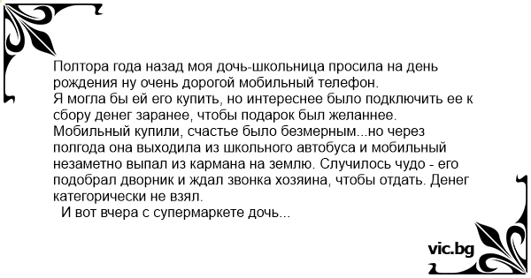 Я могла бы ей его купить, но интереснее было подключить ее к сбору денег заранее, чтобы подарок был желаннее. Мобильный купили, счастье было безмерным...но через полгода она выходила из школьного автобуса и мобильный незаметно выпал из кармана на землю. Случилось чудо - его подобрал дворник и ждал звонка хозяина, чтобы отдать. Денег категорически не взял.
