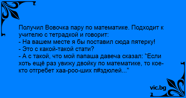 Получил Вовочка пару по математике. Подходит к учителю с тетрадкой и говорит: