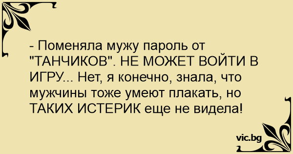 - Поменяла мужу пароль от "ТАНЧИКОВ". НЕ МОЖЕТ ВОЙТИ В ИГРУ... Нет, я конечно, знала, что мужчины тоже умеют плакать, но ТАКИХ ИСТЕРИК еще не видела!