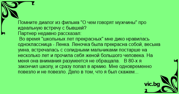 Помните диалог из фильма "О чем говорят мужчины" про идеальную встречу с бывшей?