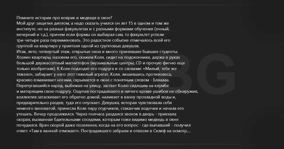 Помните истории про коврик и медведя в окне? Мой друг защитил диплом, а надо сказать учился он лет 15 в одном и том же институте, но на разных факультетах и с разными формами обучения (очный, вечерний и т.д.), причем если формы он выбирал сам, то факультет успели три-четыре раза переименовать. Это радостное событие отмечалось всей его группой на квартире у приятеля одной из групповых девушек. Итак, лето, четвертый этаж, открытые окна и много принявшие бывшие студенты. Хозяин квартиры, назовем его, скажем Коля, сидит на подоконнике, держа в руках большой двухкассетный магнитофон (музыкальные центры, CD и прочую фигню еще только изобретали). К Коле подходит его подруга и со словами: «Милый, тебе же тяжело», забирает у него этот тяжелый агрегат. Коля, лишившись противовеса, красиво взмахивает ногами, скрывается в окне с понятным словом - Бляаааа. Перепугавшийся народ, выбежав на улицу, застает Колю сидящим на клумбе и матерящим свою подругу. Ощупав пострадавшего и ничего кроме ушибов не обнаружив, коллектив затаскивает его обратно домой, наливает в ванну прохладной воды и, предварительно раздев, туда его опускает. Девушка, которая чувствовала себя немного виноватой, принесла Коле пару огурчиков, стаканчик водочки и начала его утешать. Вечер продолжился. Через полчаса раздался звонок в дверь - приехала скорая, вызванная бдительными соседями, которым тоже видимо медведь в окне почудился. Врач скорой даже позеленел, когда на его вопрос - где выпавший - получил ответ: «Там в ванной отмокает». Пострадавшего забрали и отвезли в Склиф на осмотр. Теперь сама история. Лежа на каталке в приемном покое и ожидая пока принесут результаты рентгена, Коля познакомился с мужиком, который стонал рядом. Рентген показал, что у Коли все в норме, а у мужика перелом обеих ног. Коля-то из окна выпал, а мужик о бордюр споткнулся. Все-таки водка великая вещь, а вы говорите коврик...