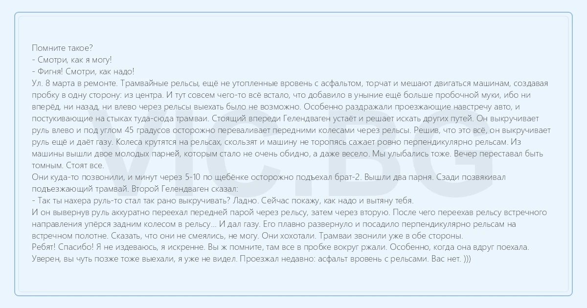 Помните такое? - Смотри, как я могу! - Фигня! Смотри, как надо! Ул. 8 марта в ремонте. Трамвайные рельсы, ещё не утопленные вровень с асфальтом, торчат и мешают двигаться машинам, создавая пробку в одну сторону: из центра. И тут совсем чего-то всё встало, что добавило в уныние ещё больше пробочной муки, ибо ни вперёд, ни назад, ни влево через рельсы выехать было не возможно. Особенно раздражали проезжающие навстречу авто, и постукивающие на стыках туда-сюда трамваи. Стоящий впереди Гелендваген устаёт и решает искать других путей. Он выкручивает руль влево и под углом 45 градусов осторожно переваливает передними колесами через рельсы. Решив, что это всё, он выкручивает руль ещё и даёт газу. Колеса крутятся на рельсах, скользят и машину не торопясь сажает ровно перпендикулярно рельсам. Из машины вышли двое молодых парней, которым стало не очень обидно, а даже весело. Мы улыбались тоже. Вечер переставал быть томным. Стоят все. Они куда-то позвонили, и минут через 5-10 по щебёнке осторожно подъехал брат-2. Вышли два парня. Сзади позвякивал подъезжающий трамвай. Второй Гелендваген сказал: - Так ты нахера руль-то стал так рано выкручивать? Ладно. Сейчас покажу, как надо и вытяну тебя. И он вывернув руль аккуратно переехал передней парой через рельсу, затем через вторую. После чего переехав рельсу встречного направления упёрся задним колесом в рельсу... И дал газу. Его плавно развернуло и посадило перпендикулярно рельсам на встречном полотне. Сказать, что они не смеялись, не могу. Они хохотали. Трамваи звонили уже в обе стороны. Ребят! Спасибо! Я не издеваюсь, я искренне. Вы ж помните, там все в пробке вокруг ржали. Особенно, когда она вдруг поехала. Уверен, вы чуть позже тоже выехали, я уже не видел. Проезжал недавно: асфальт вровень с рельсами. Вас нет. )))