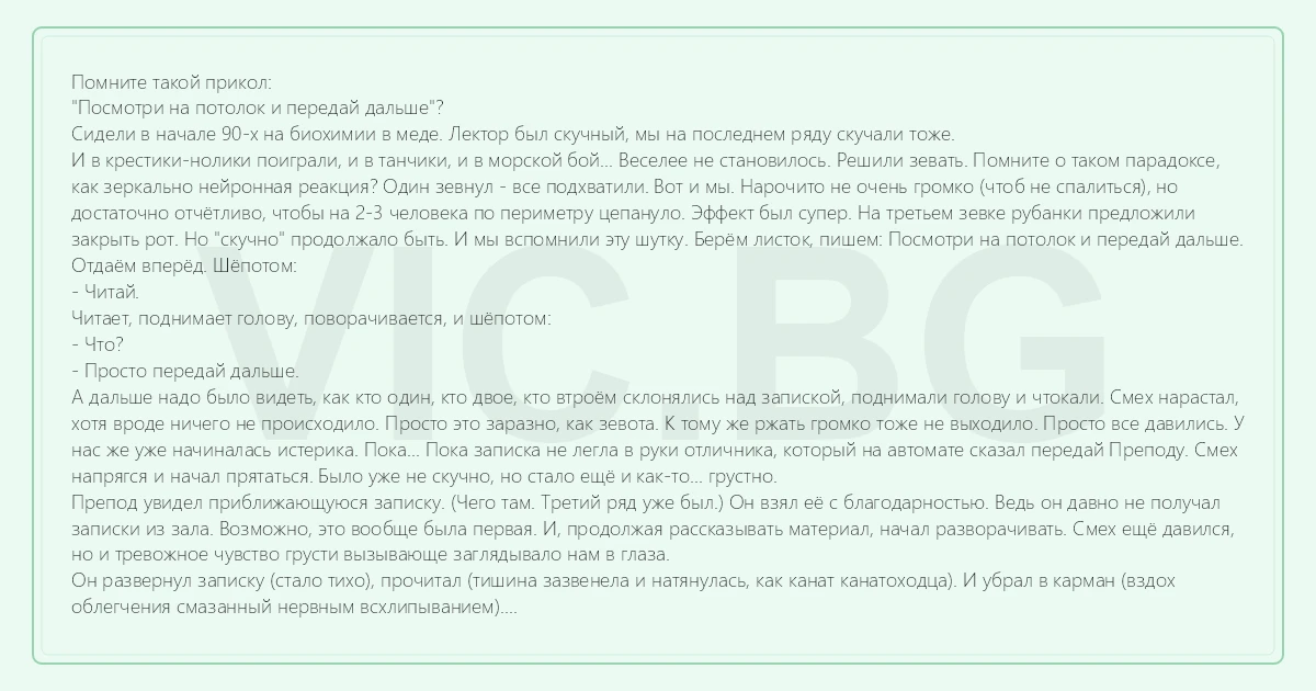 Помните такой прикол: "Посмотри на потолок и передай дальше"? Сидели в начале 90-х на биохимии в меде. Лектор был скучный, мы на последнем ряду скучали тоже. И в крестики-нолики поиграли, и в танчики, и в морской бой... Веселее не становилось. Решили зевать. Помните о таком парадоксе, как зеркально нейронная реакция? Один зевнул - все подхватили. Вот и мы. Нарочито не очень громко (чтоб не спалиться), но достаточно отчётливо, чтобы на 2-3 человека по периметру цепануло. Эффект был супер. На третьем зевке рубанки предложили закрыть рот. Но "скучно" продолжало быть. И мы вспомнили эту шутку. Берём листок, пишем: Посмотри на потолок и передай дальше. Отдаём вперёд. Шёпотом: - Читай. Читает, поднимает голову, поворачивается, и шёпотом: - Что? - Просто передай дальше. А дальше надо было видеть, как кто один, кто двое, кто втроём склонялись над запиской, поднимали голову и чтокали. Смех нарастал, хотя вроде ничего не происходило. Просто это заразно, как зевота. К тому же ржать громко тоже не выходило. Просто все давились. У нас же уже начиналась истерика. Пока... Пока записка не легла в руки отличника, который на автомате сказал передай Преподу. Смех напрягся и начал прятаться. Было уже не скучно, но стало ещё и как-то... грустно. Препод увидел приближающуюся записку. (Чего там. Третий ряд уже был.) Он взял её с благодарностью. Ведь он давно не получал записки из зала. Возможно, это вообще была первая. И, продолжая рассказывать материал, начал разворачивать. Смех ещё давился, но и тревожное чувство грусти вызывающе заглядывало нам в глаза. Он развернул записку (стало тихо), прочитал (тишина зазвенела и натянулась, как канат канатоходца). И убрал в карман (вздох облегчения смазанный нервным всхлипыванием). И вдруг БАЦ!!! ОН СТРЕЛЯЕТ ГЛАЗАМИ НА ПОТОЛОК!!! ААА!!! ДИКИЙ ХОХОТ!!! ИСТЕРИКА!!! СЛЁЗЫ!!! И Преподаватель хохочет вместе с нами. Просмеявшись сказал, что знал эту шутку. Но всё равно повёлся. И никого не наказал, хотя славился занудством и дотошностью. Всем здоровья!