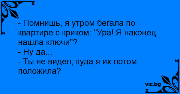 - Помнишь, я утром бегала по квартире с криком: "Ура! Я наконец нашла ключи"?